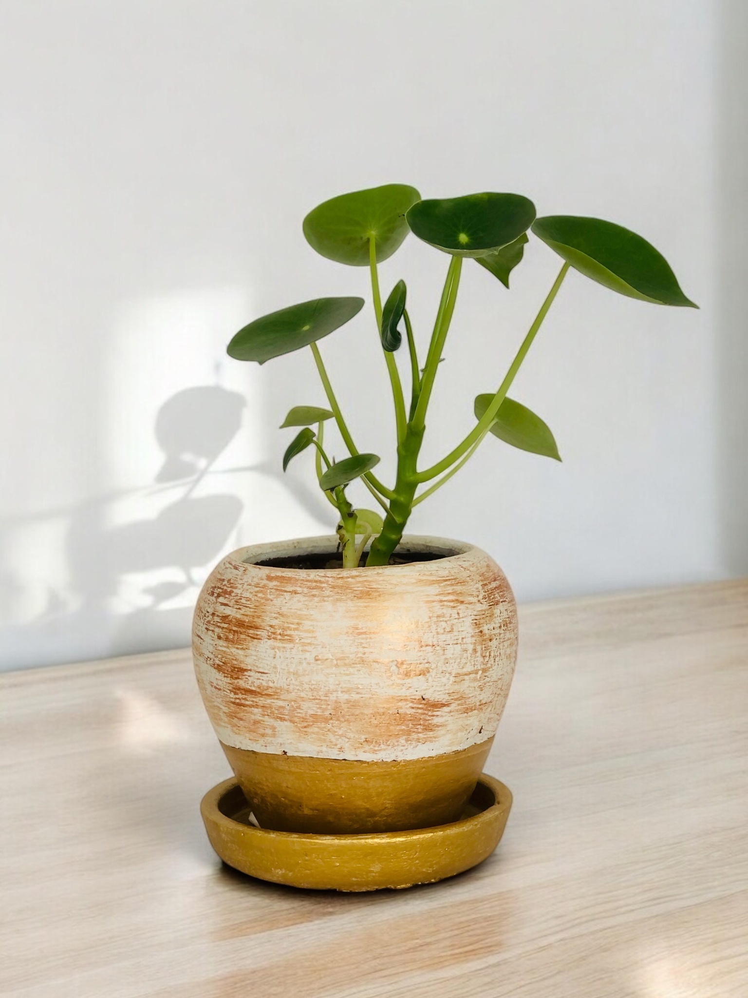 Cucharita con macetero de Diseño en arcilla color Blanco y Dorado.