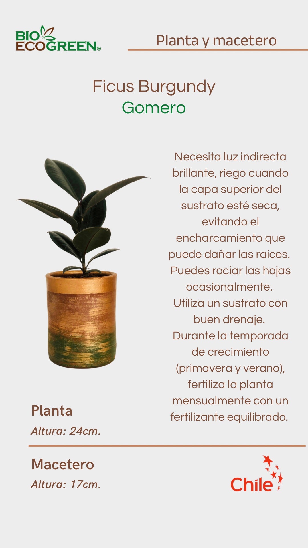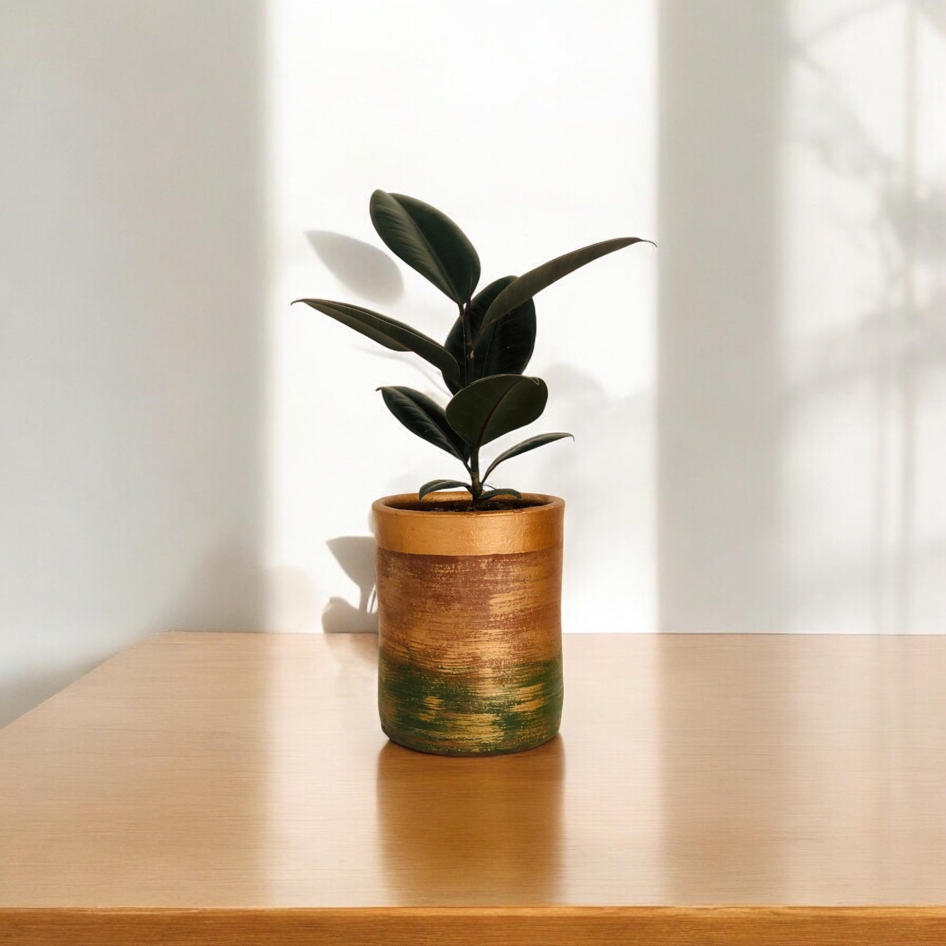 Gomero con macetero de Diseño en arcilla color Verde y Dorado.
