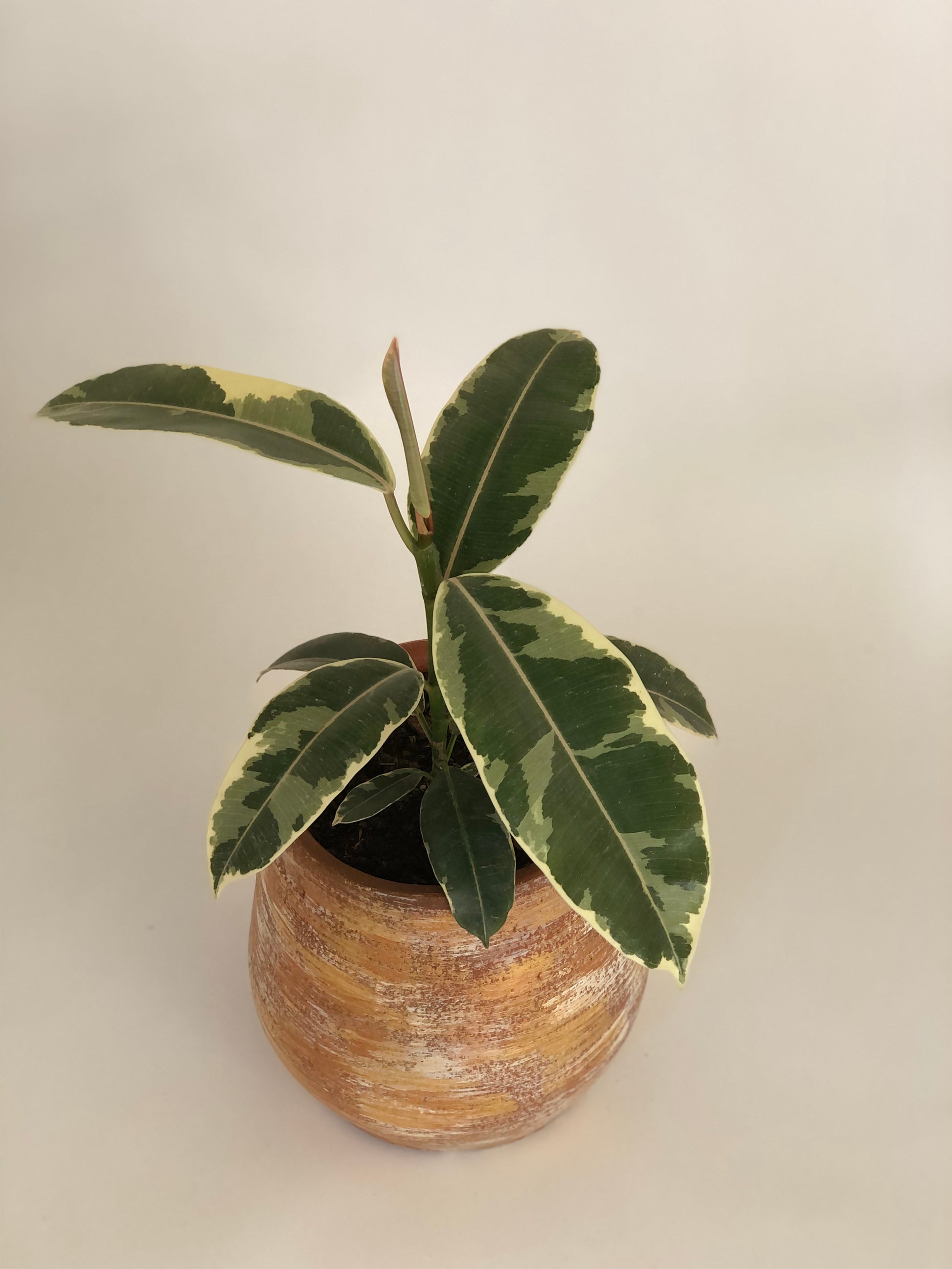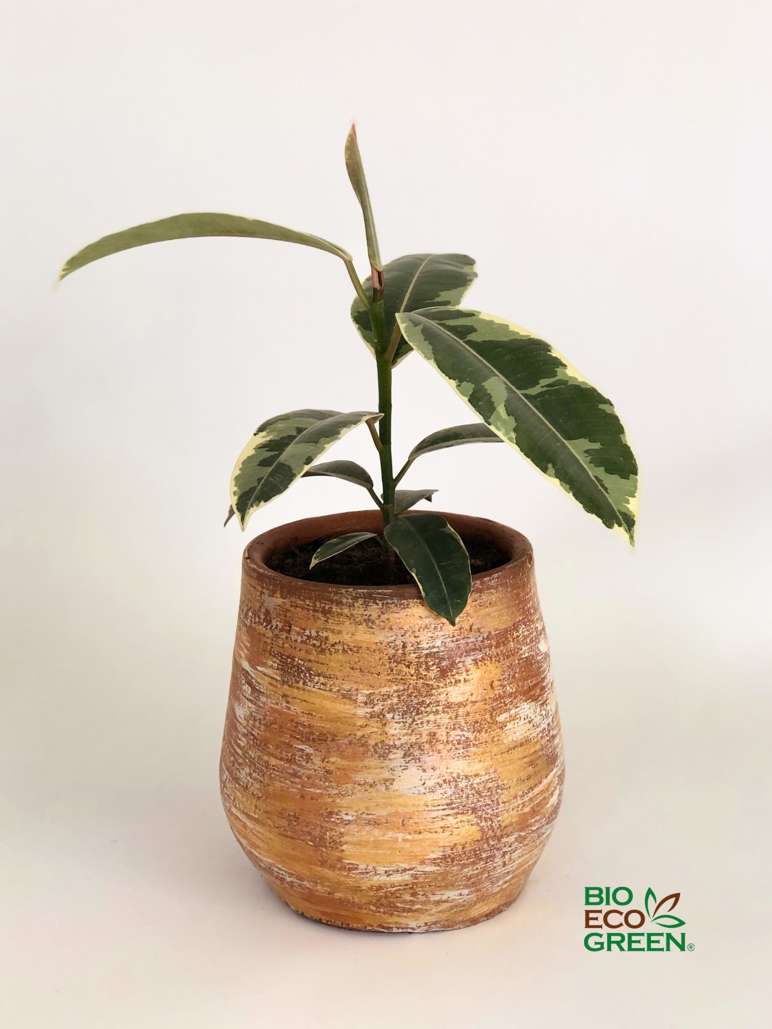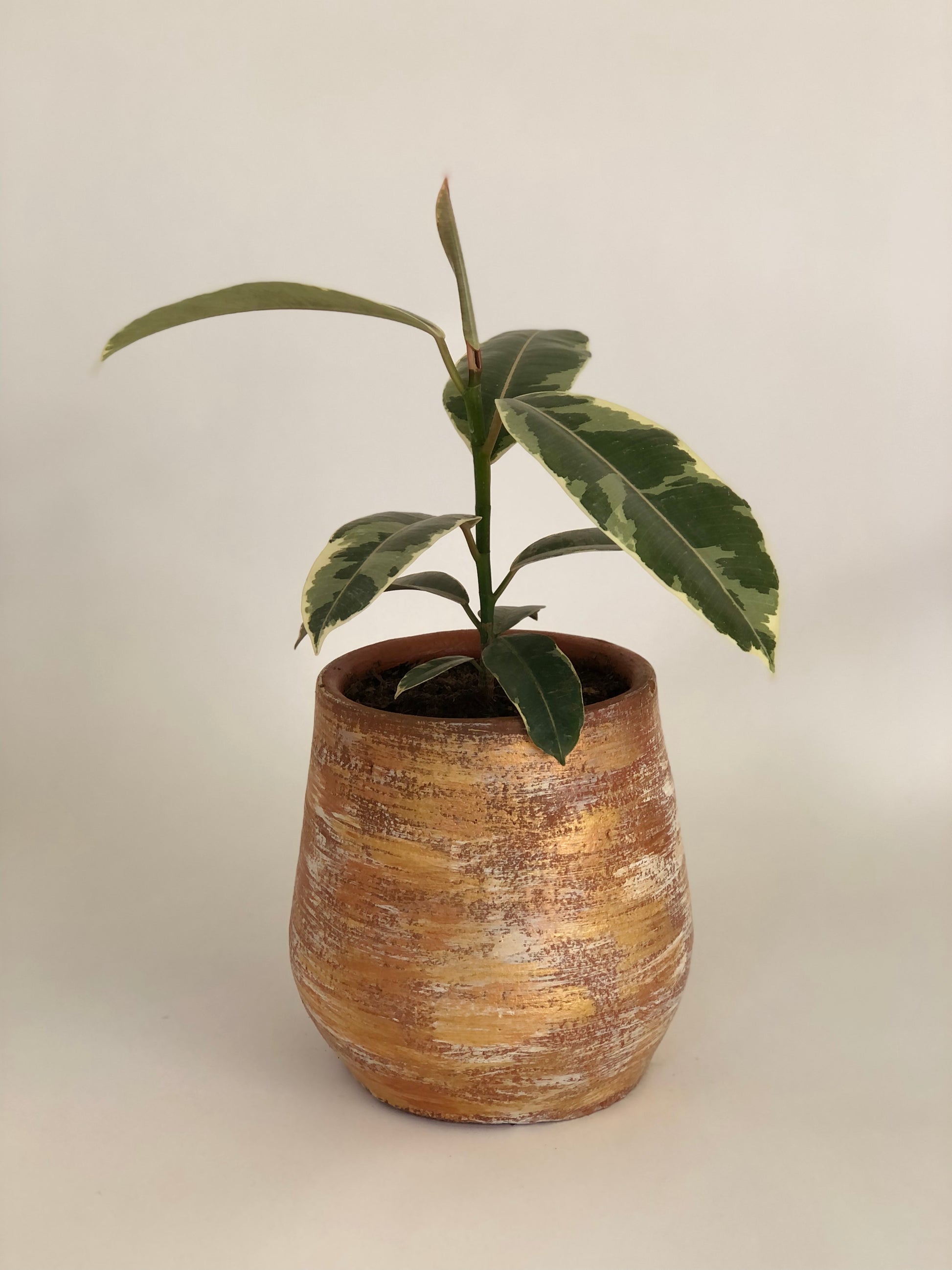 Gomero con macetero de Diseño en arcilla color Blanco y Dorado.
