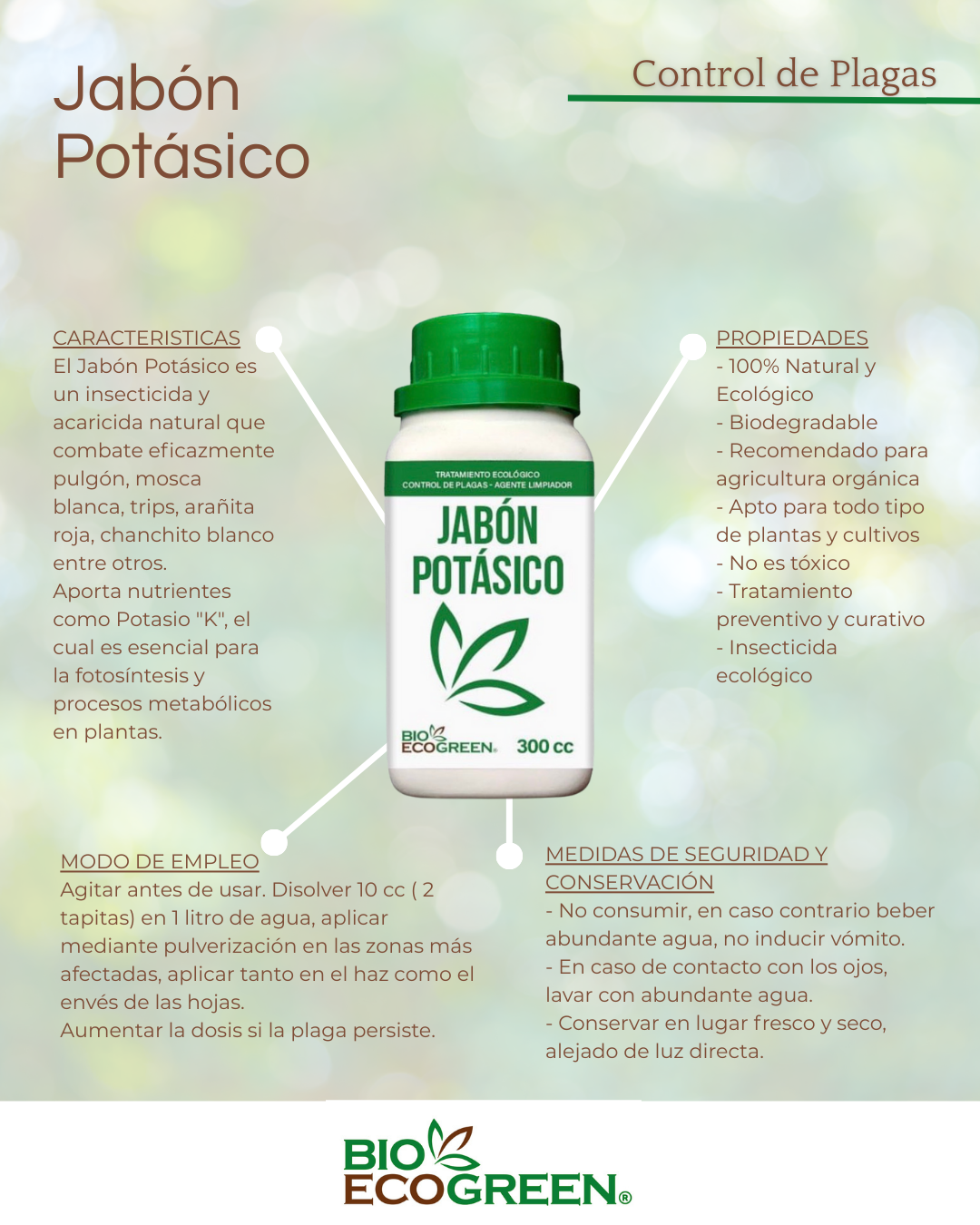 El Jabón Potásico es un insecticida y acaricida natural que combate eficazmente pulgón, mosca blanca, trips, arañita roja, chanchito blanco entre otros.